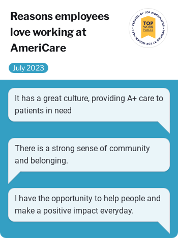 As we reflect on what truly sets AmeriCare Medical apart, it becomes clear that our commitment to care and our exceptional workplace culture are at the heart of our success. These core values have not only fueled our mission but have also been recognized by others. We are proud to be a 2023 Top Workplace. This accolade is a testament to the dedication of our entire AmeriCare family, as well as the unwavering support from our remarkable team. It serves as a reminder that our commitment to caring is not just words; they are the essence of who we are.